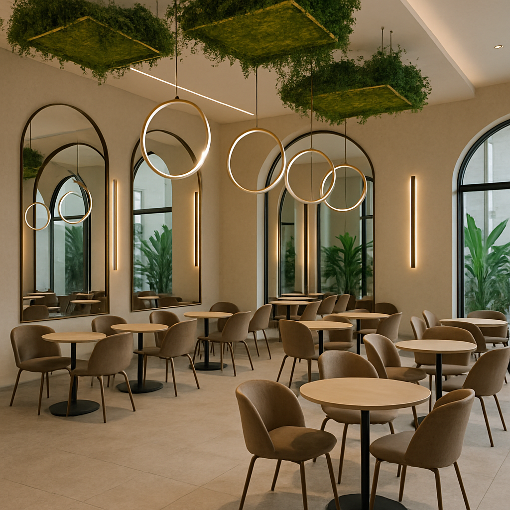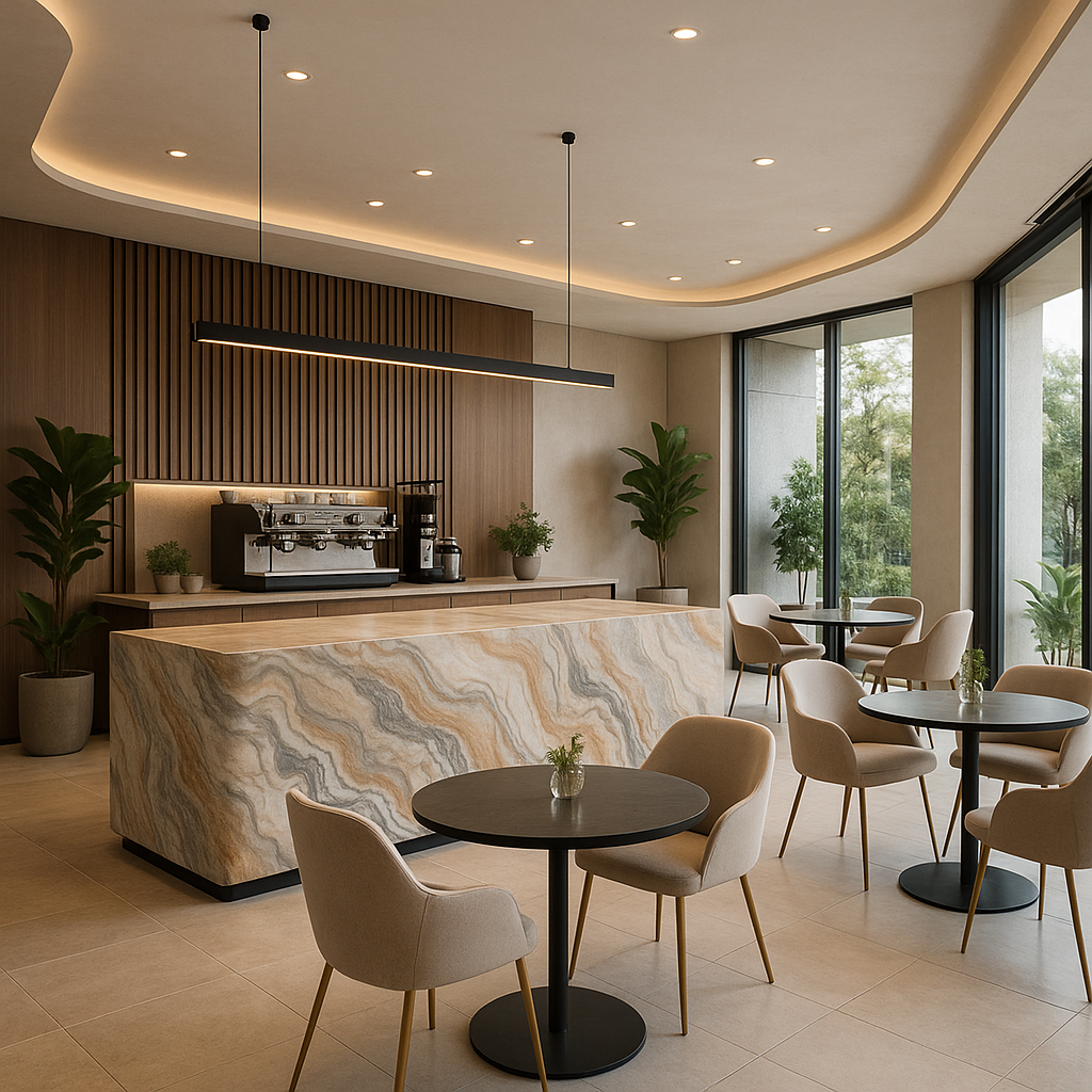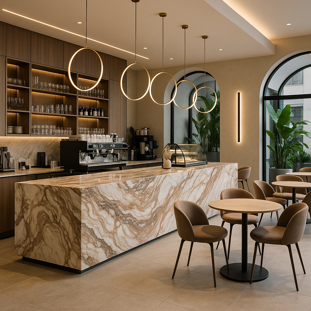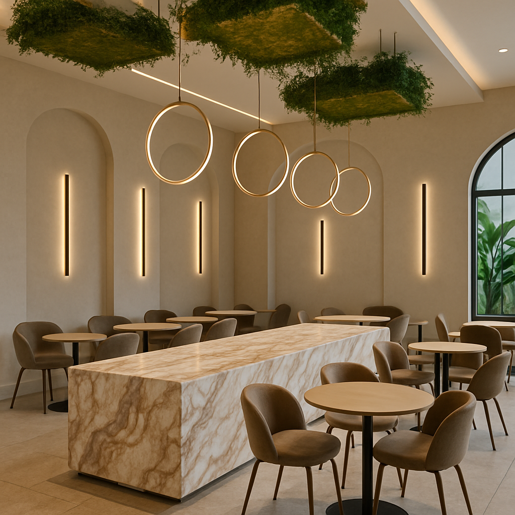 In 2024, Our latest café shop design showcases an elegant contemporary style that seamlessly blends modern sophistication with natural elements. At the heart of the space is a beautifully crafted marble counter, designed to make a bold statement with its clean lines and luxurious finish. Above, the ceiling features a striking arrangement of moss plants integrated with pendant lighting, creating a refreshing ambiance that brings nature indoors. The overall layout is both functional and stylish, offering guests a welcoming environment that elevates the café experience through thoughtful design and refined material choices.